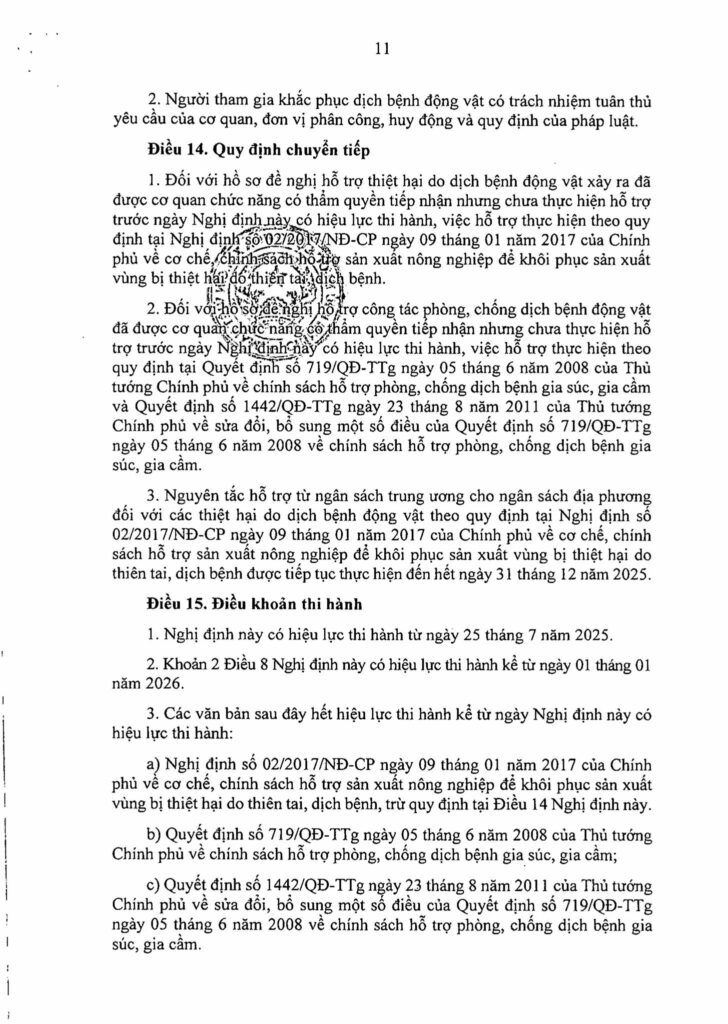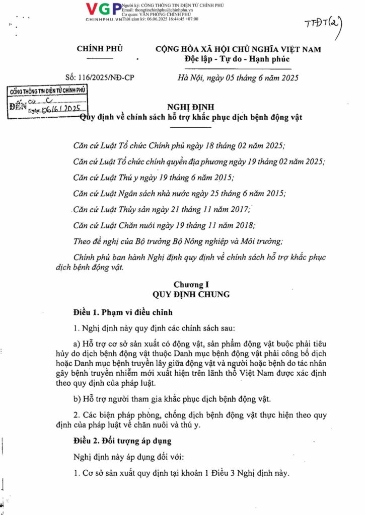 Nghị định số 116/2025/NĐ/CP ban hành ngày 05/6/2025 quy định về chính sách hỗ trợ khắc phục dịch bệnh động vật của Chính phủ